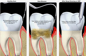 Scaling is basically the process of removing dental tartar from the surfaces of the teeth. Root planing is the process of smoothing out the root surfaces and removing any infected tooth structure. If you have gum disease or gum pocketing, the gum pockets around the teeth will have deepened, thereby allowing tartar deposits to form under the gum line.